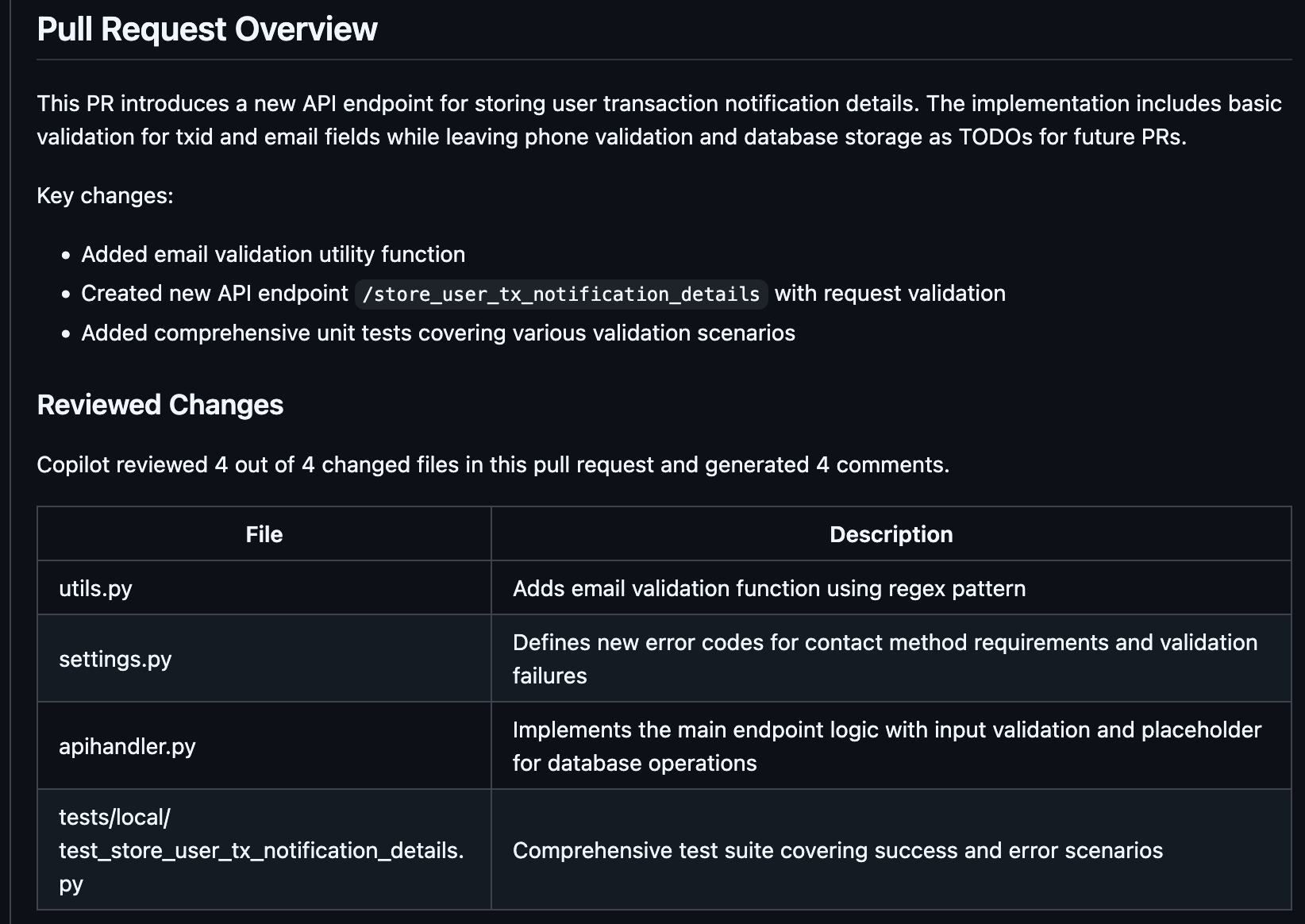 The summary is beautifully formatted and at a first glance looks like a really valuable tool for the reviewer to get the big picture of the pull request. But while you do your initial code review and read through the code you will see all of these changes (and need to understand them) yourself, forming your subjective opinion based on your knowledge of the code base, this summary starts to feel pretty hollow and the value is just not there. These PR summaries written by copilot remind me of code smell: